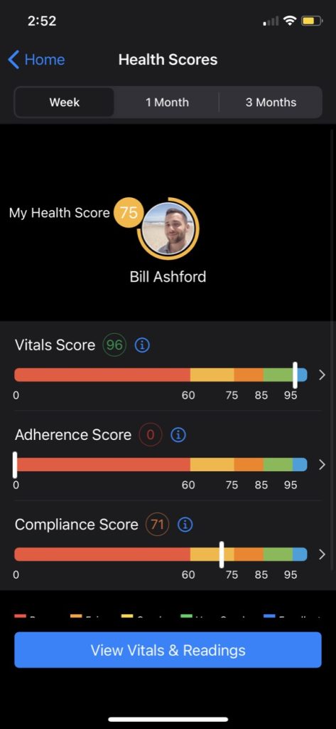 - Tap on Vitals Scores to see your measurements, Adherence Score to see how many pills you have taken and missed, and Compliance Score to see a calendar view of your readings